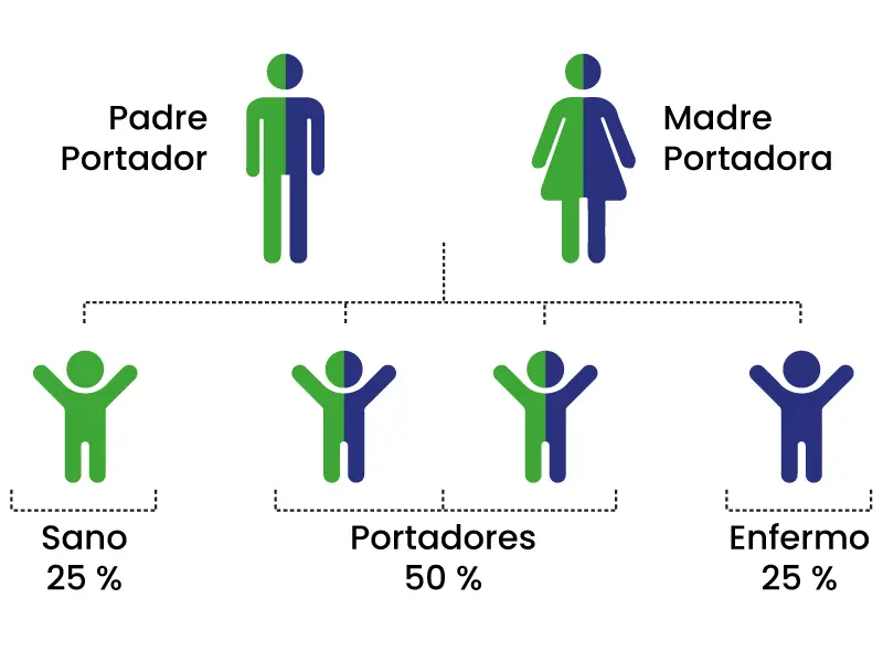 (mutación). Si dos portadores tienen un hijo, la probabilidad de que padezca una enfermedad genética es del 25%. La mayoría de personas son portadoras de alrededor 16-20 mutaciones que podría dar origen a hijos afectados.